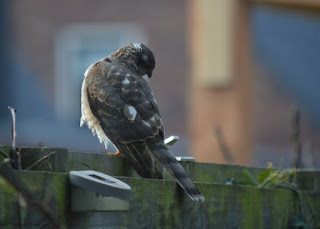 De sperwer heeft onze tuin ontdekt als zijn dagelijks eetcafé.